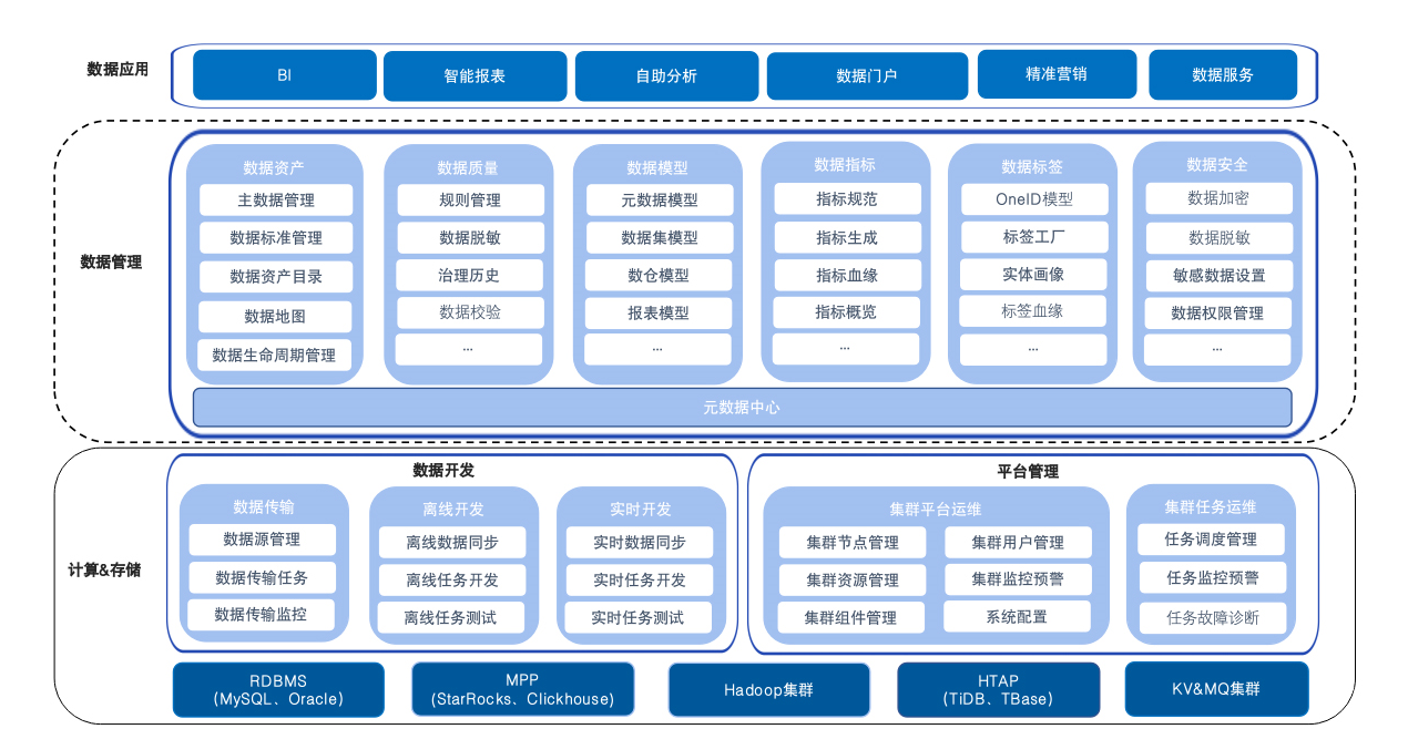 集数据集成、数据研发、数据治理、数据服务为一体的一站式数据综合应用平台,提供湖仓一体、流批一体、弹性资源调度、智能元数据管理和自动分析的能力,解决企业效率、协作、能力问题,改变企业经营管理模式,构建企业数字化的最大竞争力。